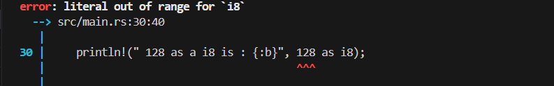 println!(" 128 as a i8 is : {:b}", 128 as i8);