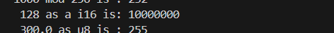 println!(" 300.0 as u8 is : {}", 300.0_f32 as u8);