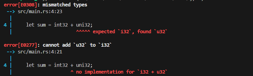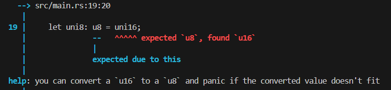 let uni8: u8 = uni16; // 서로 다른 타입의 식별자 할당