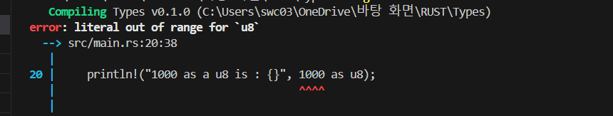 println!("1000 as a u8 is : {}", 1000 as u8); // u8의 표현 범위 밖