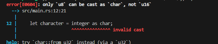 그럼에도 int to char 같은 타입 변환의 경우 1byte 크기, 즉 u8, i8 같은 크기만 허용합니다.