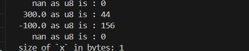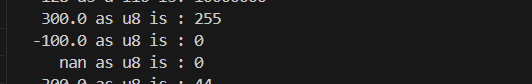 println!("-100.0 as u8 is : {}", -100.0_f32 as u8);