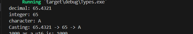 println!("Casting: {} -> {} -> {}", decimal, integer, character);